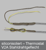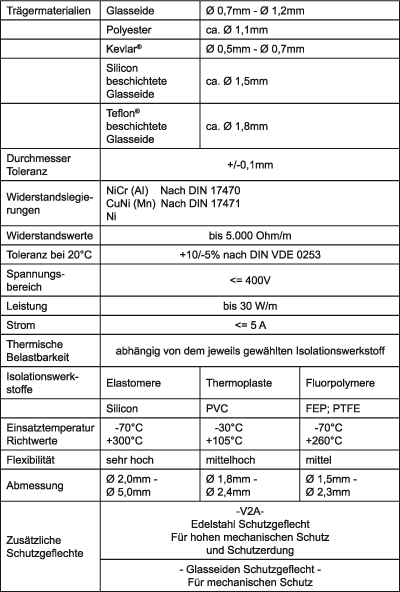 Ausführungen individuell nach Kundenwunsch auch ohne Isolierung als Meterware. Leistungen bis 30 W/m, <=5 A wobei auch innerhalb einer Leitung verschiedene Heizzonen übergangslos hergestellt werden können. Betriebsspannung <= 400V